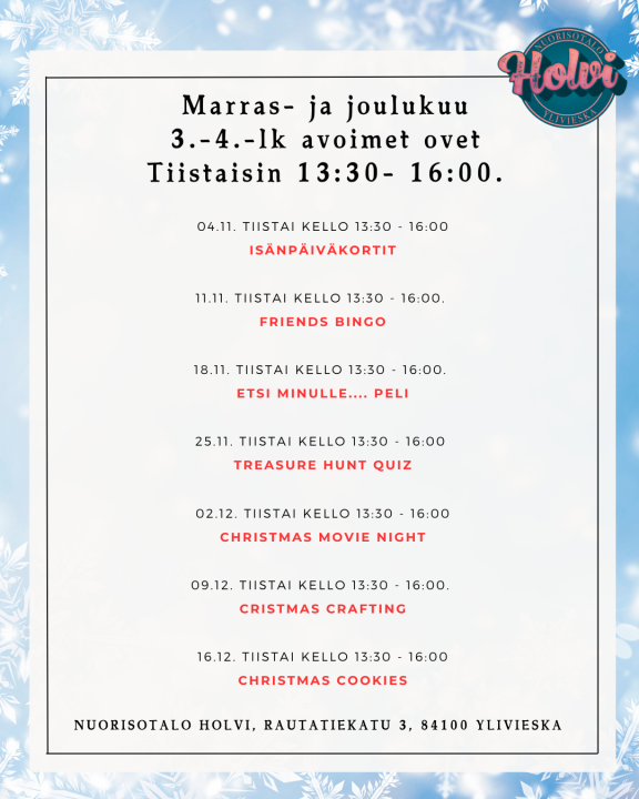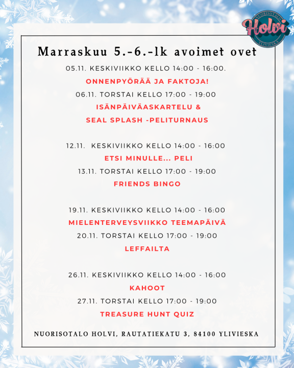 Nuorisotila Holvi on lokakuussa 2022 avattu nuorisotalo Ylivieskan keskustan ytimessä, osoite Rautatiekatu 3, 84100 Ylivieska. Holvista löytyy monenlaista tekemistä ja aktiviteettia avoimissa ovissa, ilmoitamme ohjelmasta Instagramissa @ylivieskannuorisopalvelut. Kysy lisää myös kerhotoiminnasta ja otamme toimintaehdotuksia vastaan!