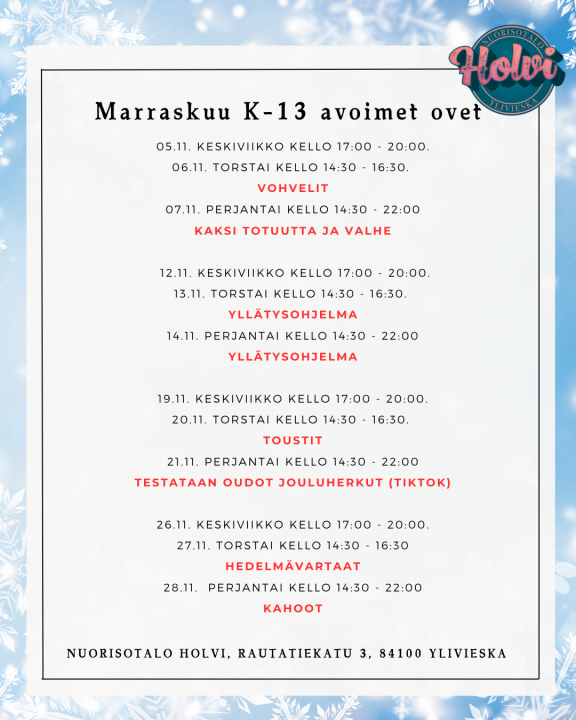 - K-13 avoimet ovet kello 17:00 – 20:00.