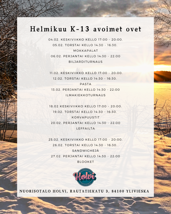 - K-13 avoimet ovet kello 17:00 – 20:00.