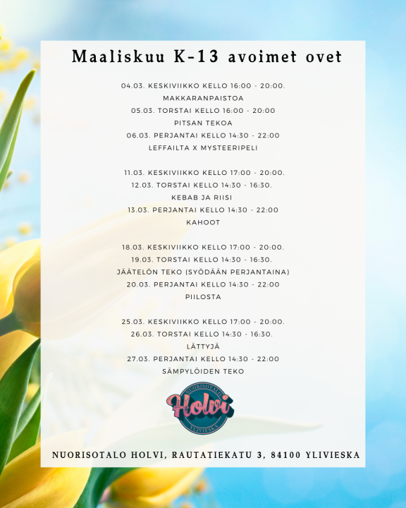 - K-13 avoimet ovet kello 14:30 – 16:30.