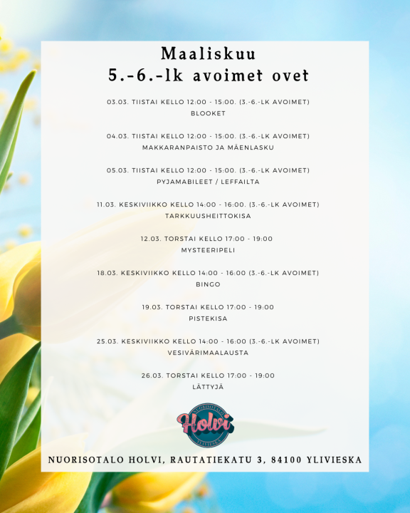 - 5.-6.-luokkalaisten avoimet ovet kello 14:00 – 16:00. (Viikosta 11 lähtien muuttuvat 3.-6.-luokkalaisten avoimiksi oviksi.)