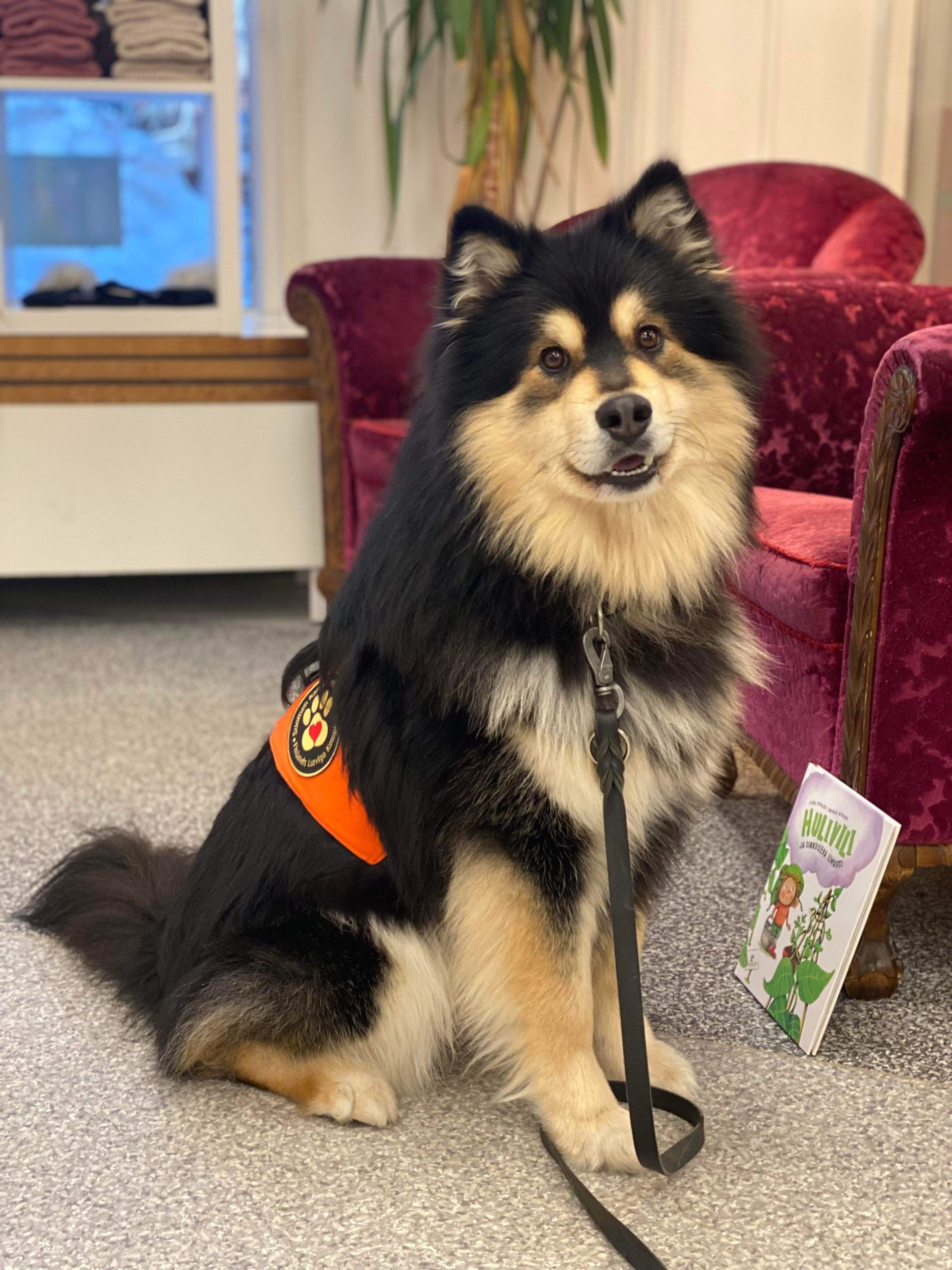 Lukulemmikkinä toimiva Jämy-koira vierailee ajoittain kirjastossa. Seuraa kirjaston some-kanavia ja varaa aikasi omaan lukuhetkeen.